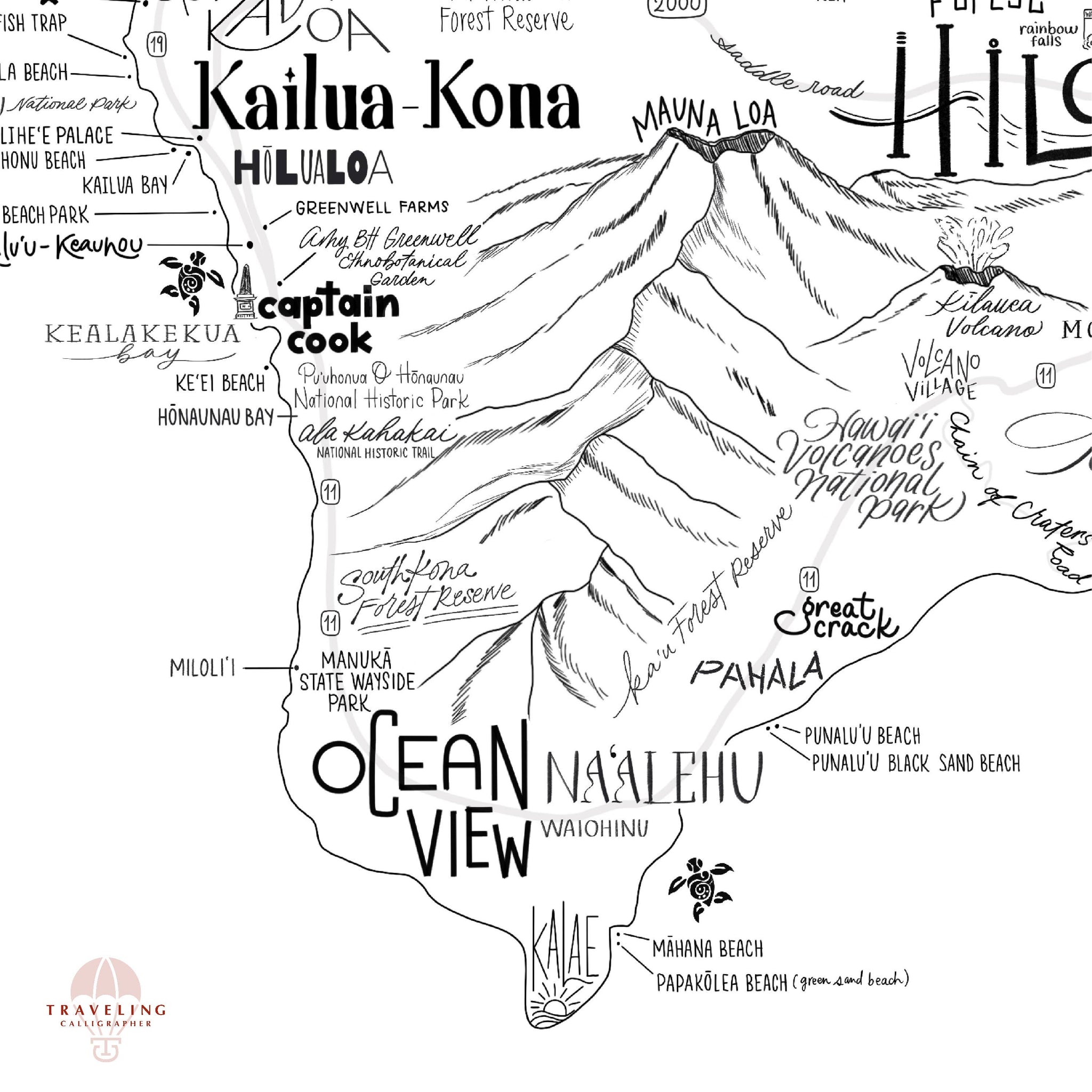 Big Island, Hawaii Neighborhood map hand-lettered and illustrated by Queeny Lu of Traveling Calligrapher. PRINT DETAILS • All prints are printed on high-quality matte paper, 89gsm, 60lb cover • All prints are printed in archival ink to prevent from fading over time STANDARD SIZES (industry-standard sizes to make framing easy)